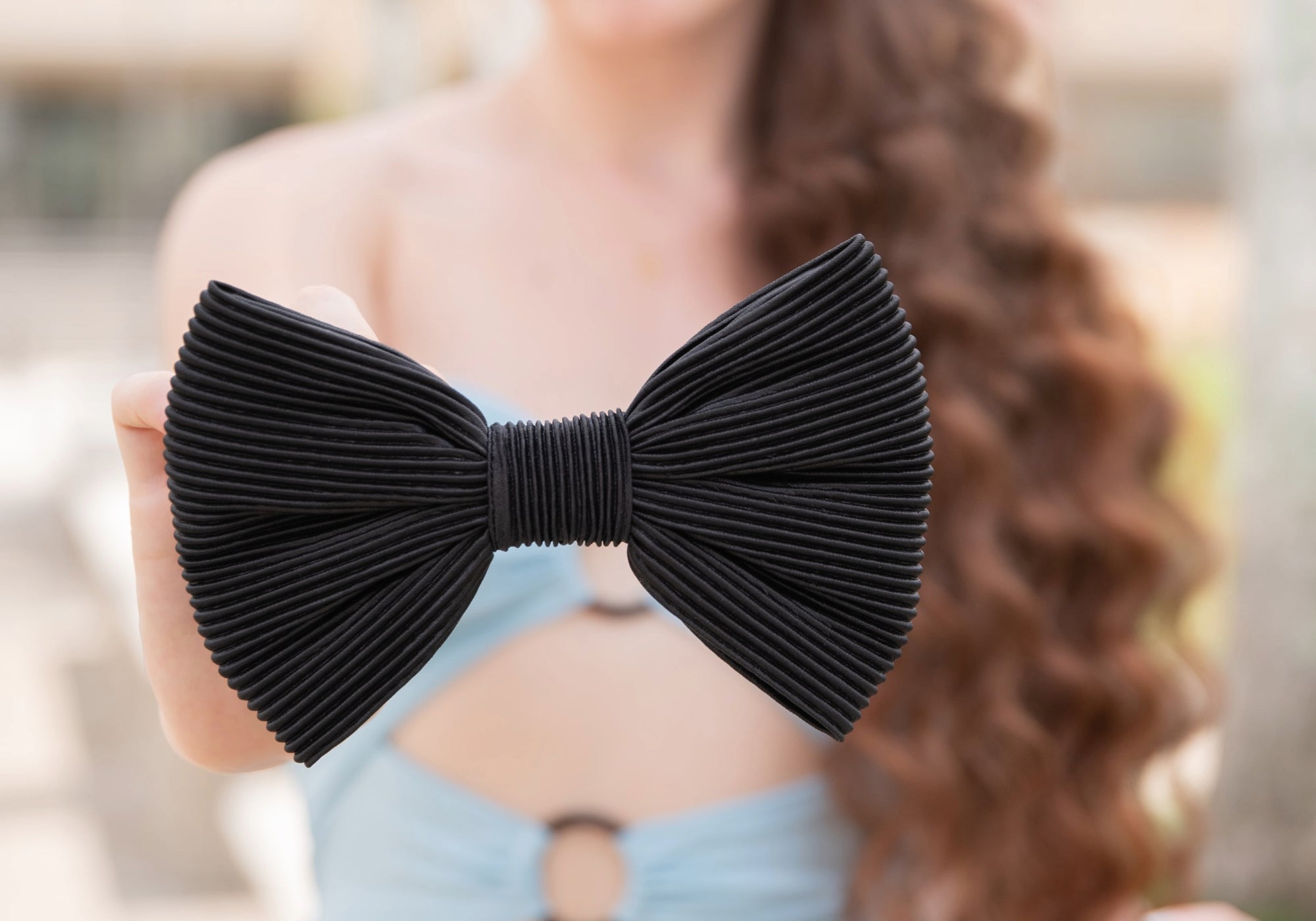 El moño Adaia tipo corbatín, con su diseño único en tela plisada, añade un toque de elegancia y glamour. Ideal para un look original, es el detalle perfecto para realzar tu estilo.