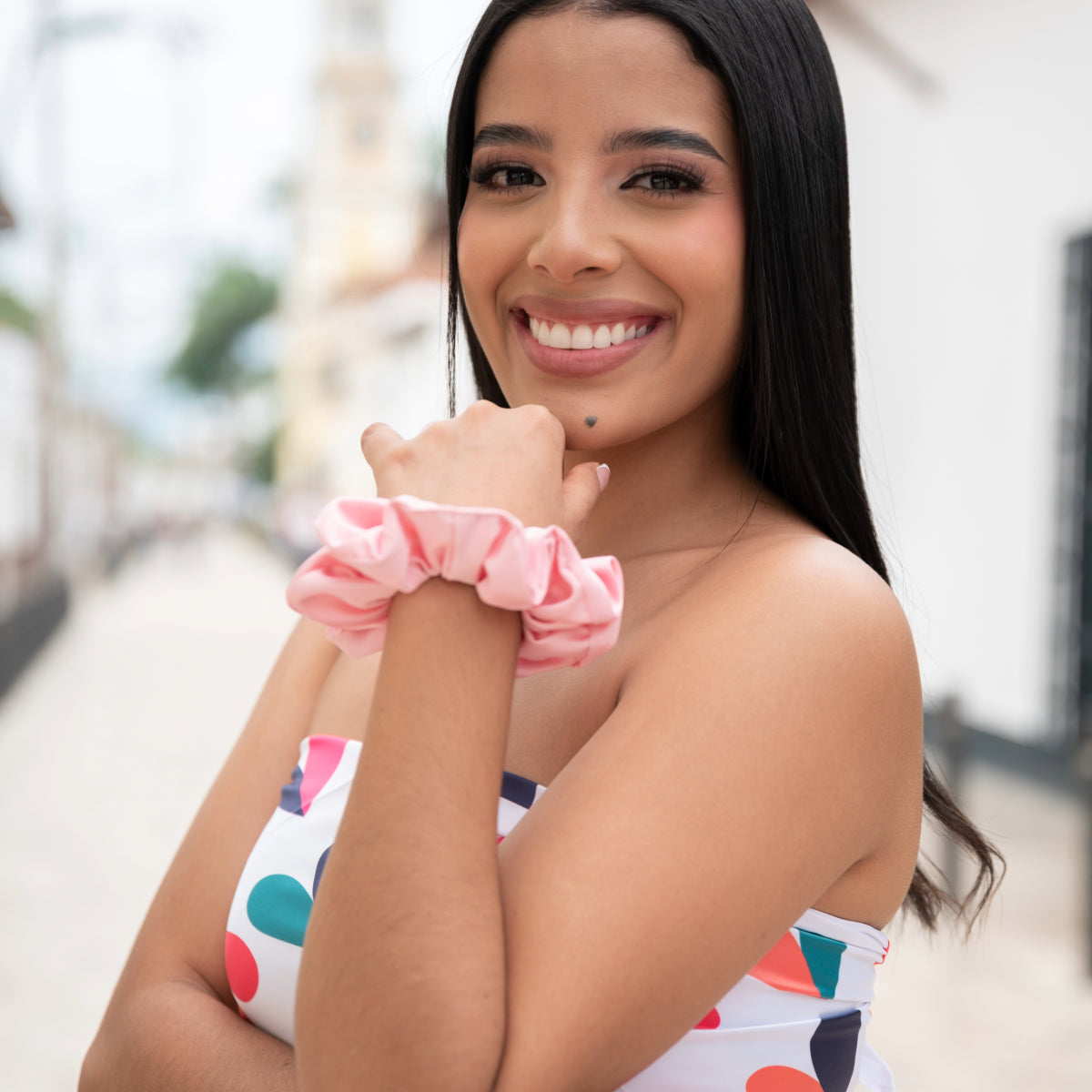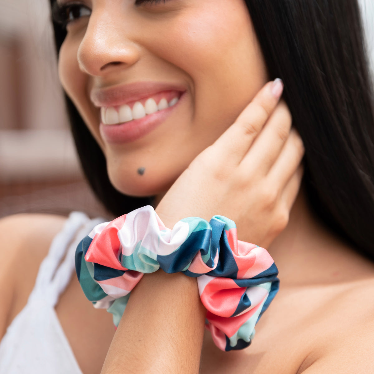 Gracias a su suave material, el scrunchie reduce el riesgo de enredos y quiebres, evitando las marcas que a menudo dejan las bandas elásticas convencionales. Es el accesorio ideal para cuidar tu cabello mientras luces con estilo.